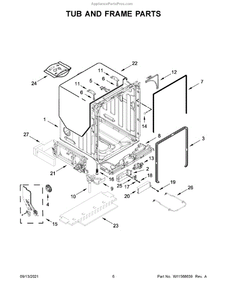 Protective corner cover that installs at the base of the dishwasher tub wall. Replace if cracked, chipped, or damaged from repeated door contact.