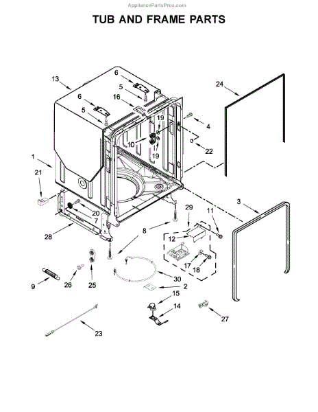 If your dishwasher door drops, slams, or feels heavy, the door balance mount may be broken. This side-frame bracket anchors the spring system.