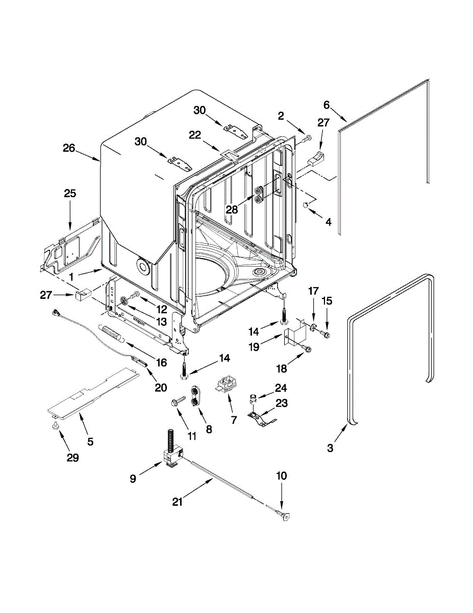 Positions and supports the dishwasher tank assembly to maintain proper alignment. Replace if worn, cracked, or missing to restore correct spacing.