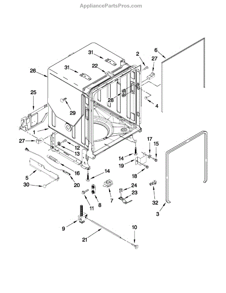 If your dishwasher door drops, slams, or feels heavy, the door balance mount may be broken. This side-frame bracket anchors the spring system.