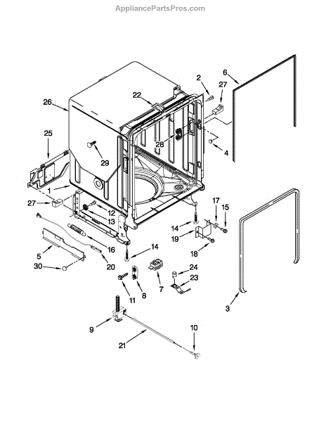 If your dishwasher door drops, slams, or feels heavy, the door balance mount may be broken. This side-frame bracket anchors the spring system.
