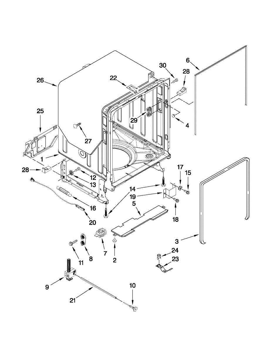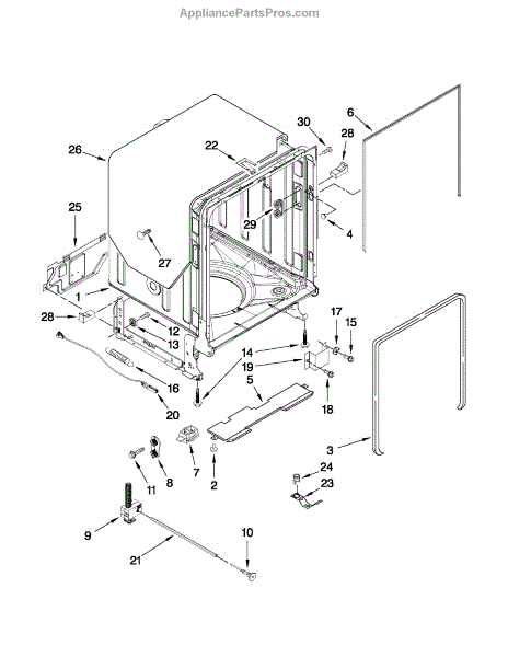 If your dishwasher door drops, slams, or feels heavy, the door balance mount may be broken. This side-frame bracket anchors the spring system.