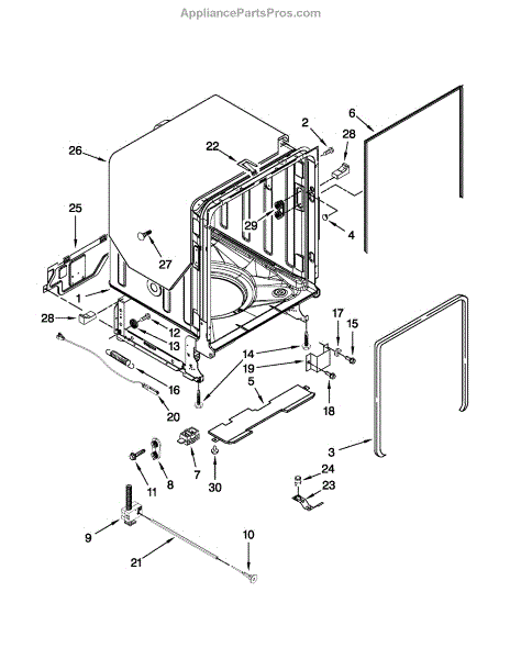 If your dishwasher door drops, slams, or feels heavy, the door balance mount may be broken. This side-frame bracket anchors the spring system.