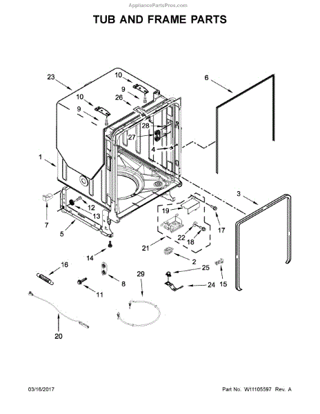If your dishwasher door drops, slams, or feels heavy, the door balance mount may be broken. This side-frame bracket anchors the spring system.