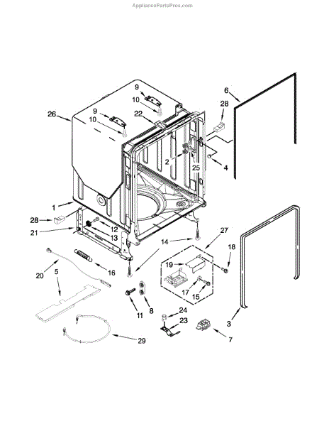Positions and supports the dishwasher tank assembly to maintain proper alignment. Replace if worn, cracked, or missing to restore correct spacing.