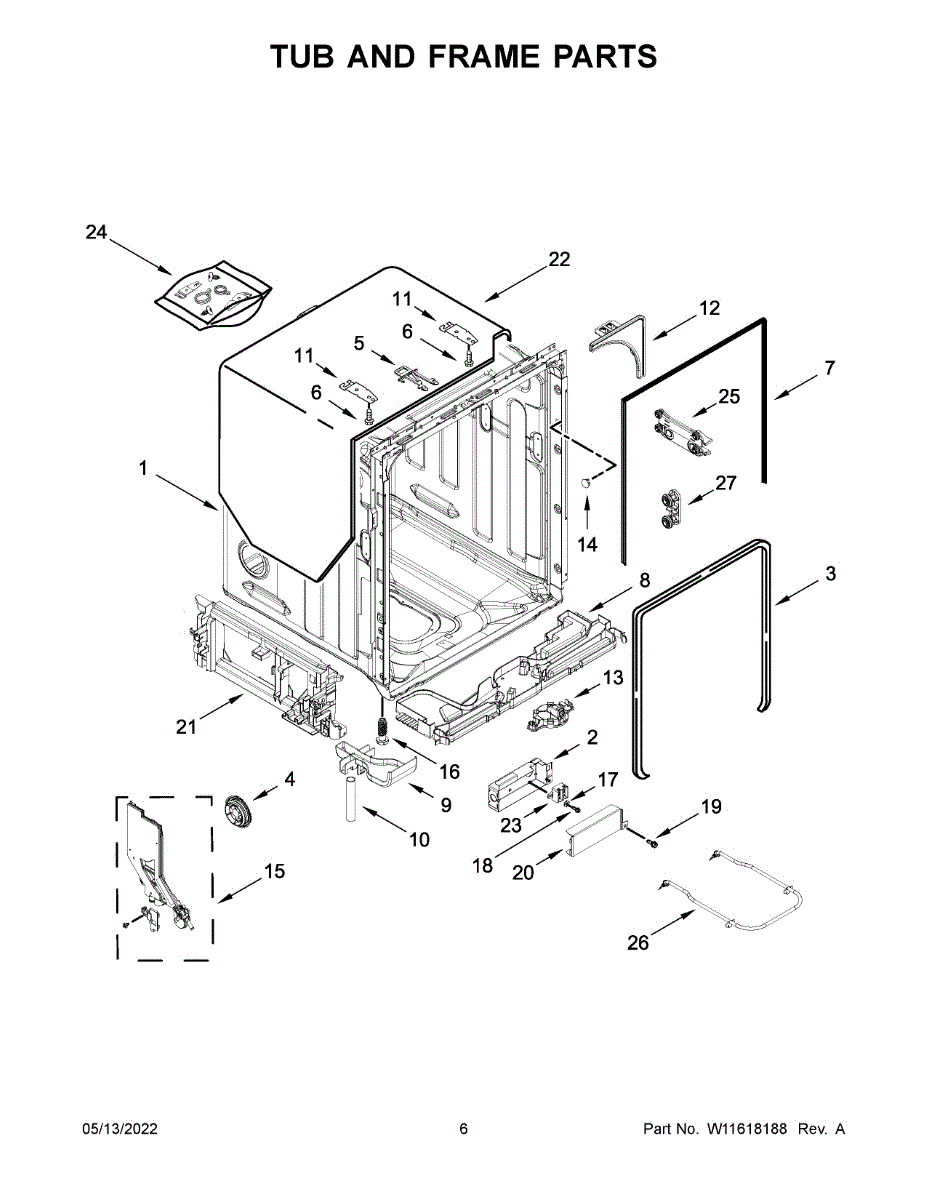 The Tub Gasket is an OEM part for Whirlpool dishwashers. It seals the space between the washer tub and the surrounding door frame to prevent leaks. During wash cycles, water, heat, and detergent can degrade this rubber gasket material over time.