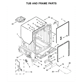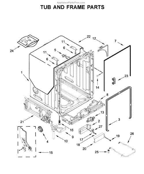 The Tub Gasket is an OEM part for Whirlpool dishwashers. It seals the space between the washer tub and the surrounding door frame to prevent leaks. During wash cycles, water, heat, and detergent can degrade this rubber gasket material over time.