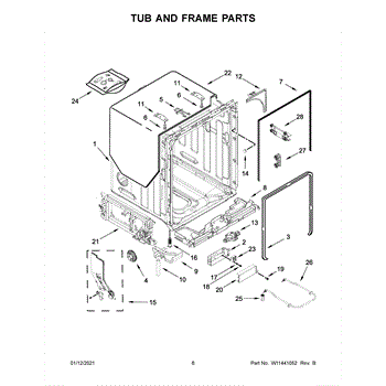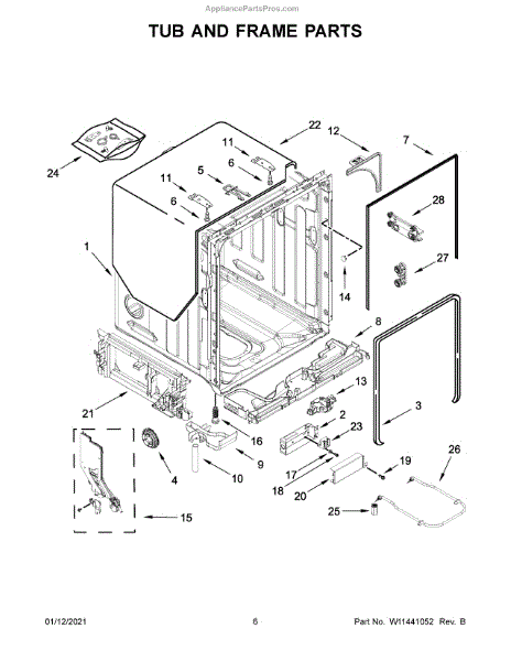 The Tub Gasket is an OEM part for Whirlpool dishwashers. It seals the space between the washer tub and the surrounding door frame to prevent leaks. During wash cycles, water, heat, and detergent can degrade this rubber gasket material over time.
