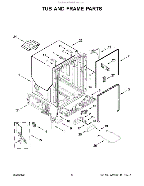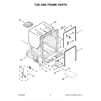 The Tub Gasket is an OEM part for Whirlpool dishwashers. It seals the space between the washer tub and the surrounding door frame to prevent leaks. During wash cycles, water, heat, and detergent can degrade this rubber gasket material over time.