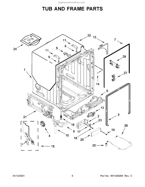 The Tub Gasket is an OEM part for Whirlpool dishwashers. It seals the space between the washer tub and the surrounding door frame to prevent leaks. During wash cycles, water, heat, and detergent can degrade this rubber gasket material over time.
