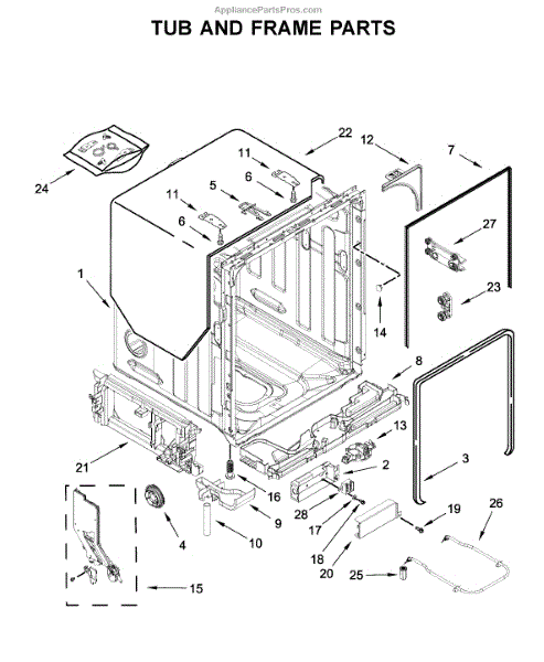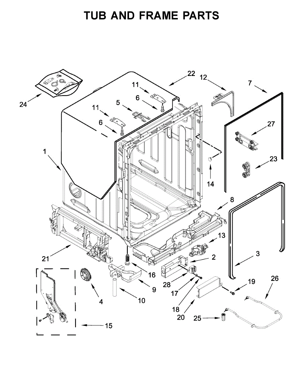 The Tub Gasket is an OEM part for Whirlpool dishwashers. It seals the space between the washer tub and the surrounding door frame to prevent leaks. During wash cycles, water, heat, and detergent can degrade this rubber gasket material over time.