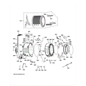 Washer drum basket holds clothes during wash cycles. Replace if cracked, rusted, or damaged with broken ribs. Installs inside outer tub assembly.