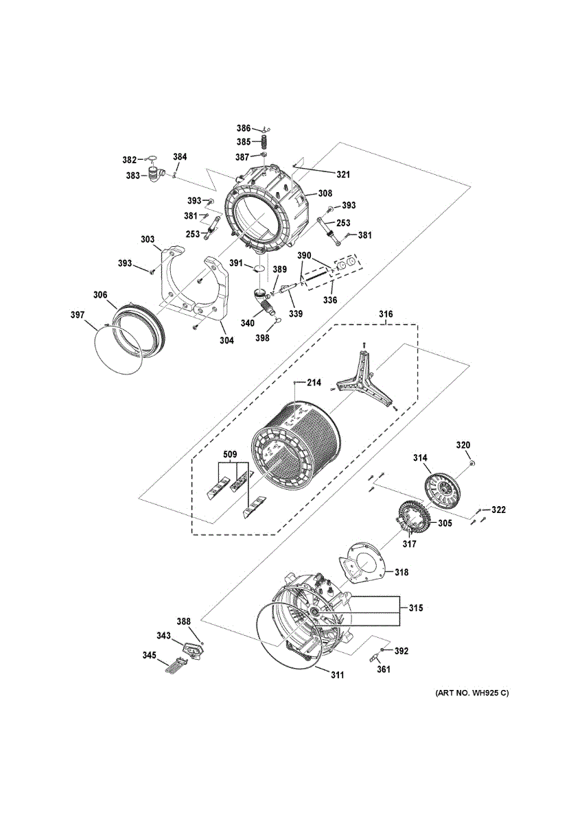 This basket assembly is a genuine OEM replacement part sourced directly from the manufacturer for use in front-load washing machines. This assembly is part of the washer's drive system. It is on top of the clutch and transmission system. It contains the spin tube shaft and brake system for the spin basket. If the washing machine is making loud noises during the spin cycle or won't spin at all, the basket assembly should be replaced. A screwdriver, socket wrench set and ratchet, hammer, and spanner wrench are needed to make this repair. Disconnect the water and power to the washing machine. Wear work gloves when making these repairs. Make sure the machine is pulled away from the wall, and there is plenty of room to work while disassembling the machine. Remove the top console and then the washing machine cabinet. Take the tub ring and agitator off the machine. Remove the spin basket and drive block and release the drive block. Remove and replace the basket drive. Reverse the order and reassemble the washing machine. Reconnect the power and water. This basket assembly is sold individually. It is designed for washing machines manufactured by General Electric.