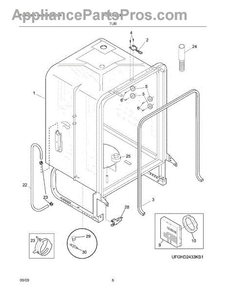 Dishwasher tub assembly forms the main interior wash chamber. Replace if cracked, rusted, warped, or leaking to restore structural integrity.