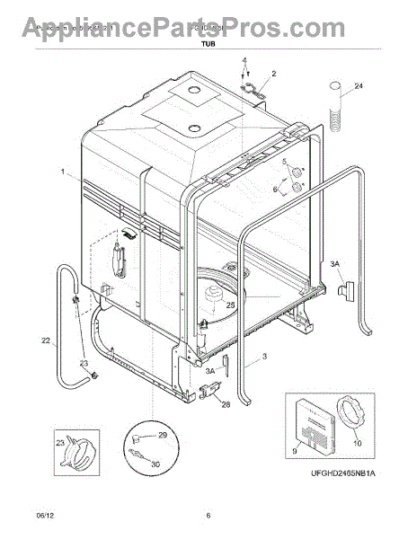 Dishwasher tub assembly forms the main interior wash chamber. Replace if cracked, rusted, warped, or leaking to restore structural integrity.
