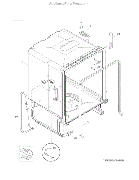 Secures dishwasher hoses to prevent leaks and water damage. Replace if loose, cracked, or leaking. Verify fit with your model number before ordering.
