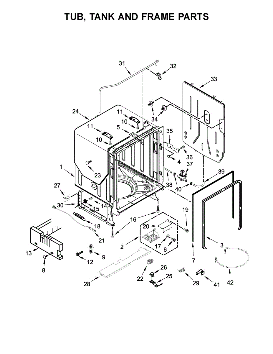 Replace a cracked or leaking dishwasher water tank assembly. This structural component stores water during the wash cycle and installs in the base.