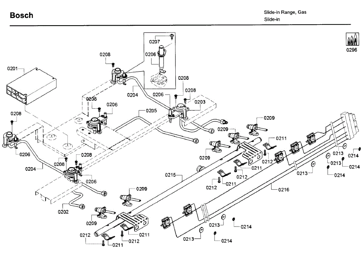 The BURNER TUBE is an OEM part specifically designed for Bosch gas ranges. Each polished steel tube situated below grates routes gas directly to dedicated flame ports heating individual cooking zones.