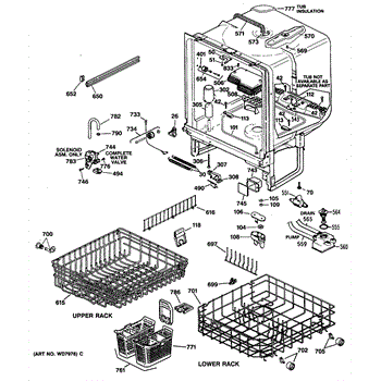 The Upper Rack is an OEM replacement part for GE dishwashers. It provides movable shelf space along the top of the dishwasher interior for washing plates, bowls, and other dishes. The shelves feature an adjustable design that accommodates various sizes and configurations of dishware. Causes of failure include normal wear and tear, accidental impacts that damage shelves or cleaning chemicals stripping away protective coatings. Symptoms of a bad upper rack can include: