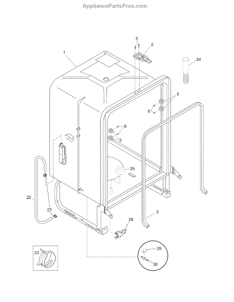 Secures dishwasher hoses to prevent leaks and water damage. Replace if loose, cracked, or leaking. Verify fit with your model number before ordering.