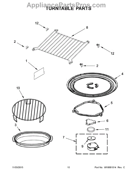 The Turntable Tray is an OEM part for Whirlpool microwaves. It sits on the turntable support and rotates to ensure even cooking and heating of food. The tray is designed to withstand high temperatures and is essential for the microwave’s efficient operation.