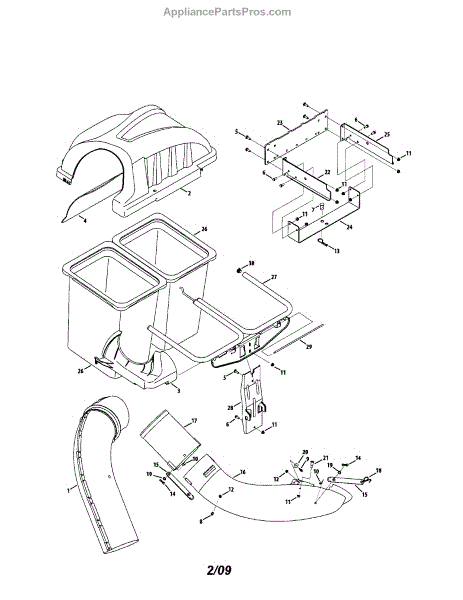 This upper chute assembly is part of a riding lawnmower bagging system. As the grass is mowed, it is pulled up and through the upper chute, where it is deposited in the grass bag. This is an OEM replacement part sourced directly from the manufacturer. If the upper chute has become damaged due to age or exposure to the elements, this part should be installed to repair the lawnmower.If the upper chute is damaged, grass clippings may not be fully bagged. Cracks in the chute can reduce efficiency, and some of the clippings may remain on the ground or eventually clog the tube. If the bag doesn't appear to be catching clippings after mowing, the upper chute assembly should be inspected. To repair the upper chute assembly, remove the machine's bagger and locate the damaged upper chute. Remove the damaged upper chute and dispose of it. Install the new upper chute and replace the mower bag. This upper chute assembly is a black plastic molded part that is sold individually. It is designed for use on lawnmowers manufactured by MTD and Craftsman.