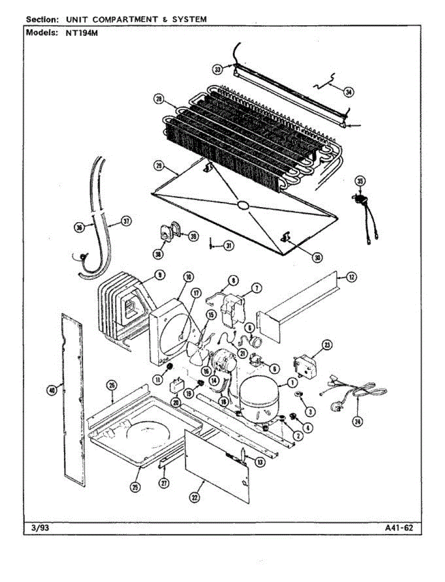 Plastic defrost pan. Evaporator pan hangs from side rails and rests on compressor.