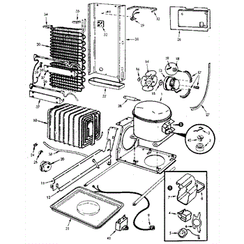 Plastic defrost pan. Evaporator pan hangs from side rails and rests on compressor.