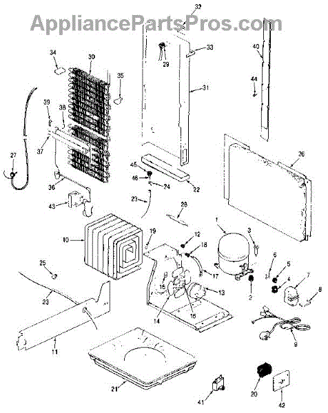 Plastic defrost pan. Evaporator pan hangs from side rails and rests on compressor.