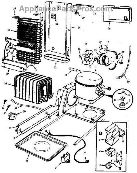 Plastic defrost pan. Evaporator pan hangs from side rails and rests on compressor.