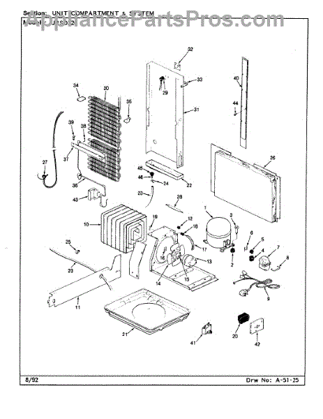 Plastic defrost pan. Evaporator pan hangs from side rails and rests on compressor.
