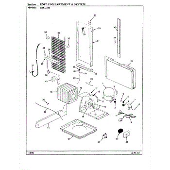 Plastic defrost pan. Evaporator pan hangs from side rails and rests on compressor.