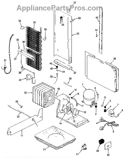 Plastic defrost pan. Evaporator pan hangs from side rails and rests on compressor.