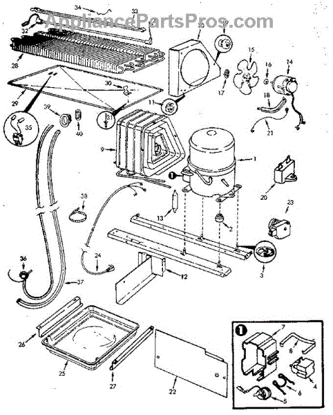 Plastic defrost pan. Evaporator pan hangs from side rails and rests on compressor.