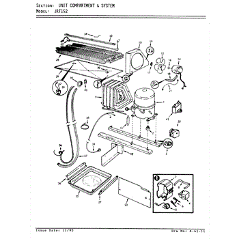 Plastic defrost pan. Evaporator pan hangs from side rails and rests on compressor.
