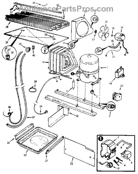Plastic defrost pan. Evaporator pan hangs from side rails and rests on compressor.