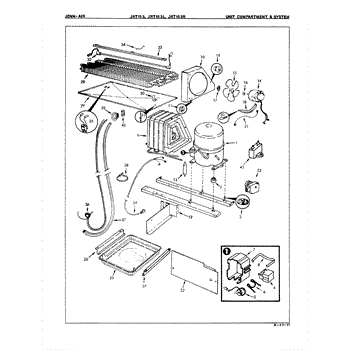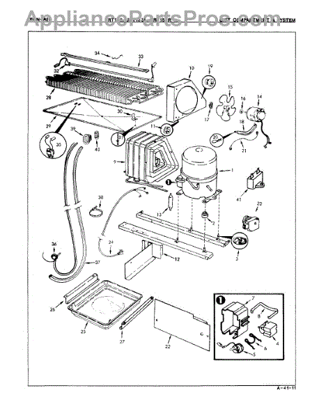 Plastic defrost pan. Evaporator pan hangs from side rails and rests on compressor.