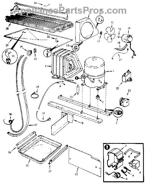 Plastic defrost pan. Evaporator pan hangs from side rails and rests on compressor.