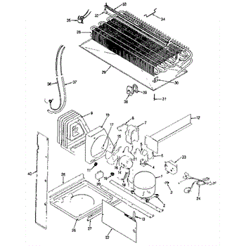 Plastic defrost pan. Evaporator pan hangs from side rails and rests on compressor.