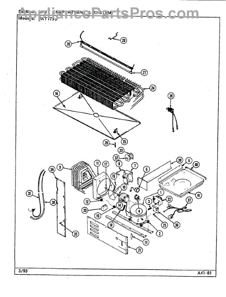 Plastic defrost pan. Evaporator pan hangs from side rails and rests on compressor.