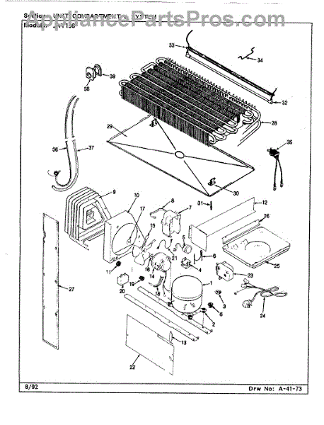 Plastic defrost pan. Evaporator pan hangs from side rails and rests on compressor.