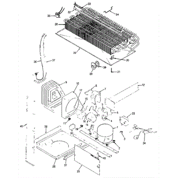 Plastic defrost pan. Evaporator pan hangs from side rails and rests on compressor.