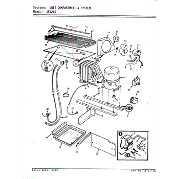 Plastic defrost pan. Evaporator pan hangs from side rails and rests on compressor.