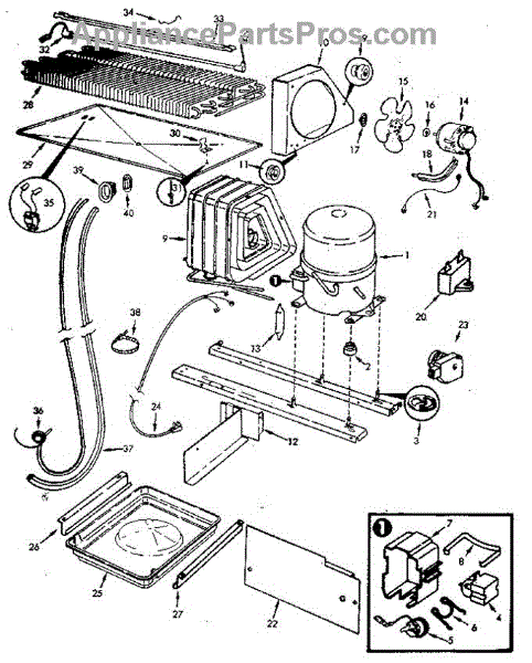 Plastic defrost pan. Evaporator pan hangs from side rails and rests on compressor.