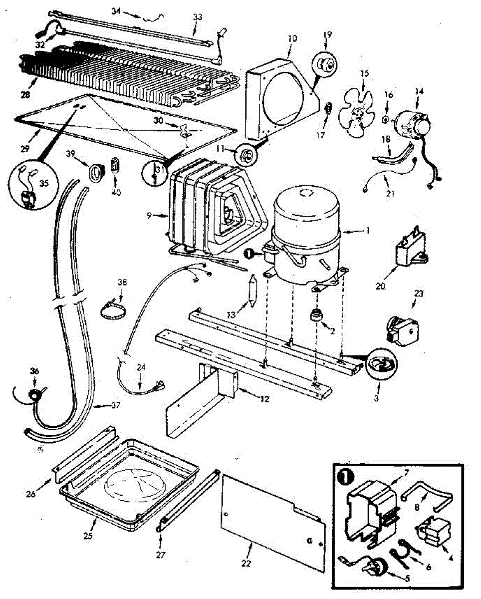 Plastic defrost pan. Evaporator pan hangs from side rails and rests on compressor.