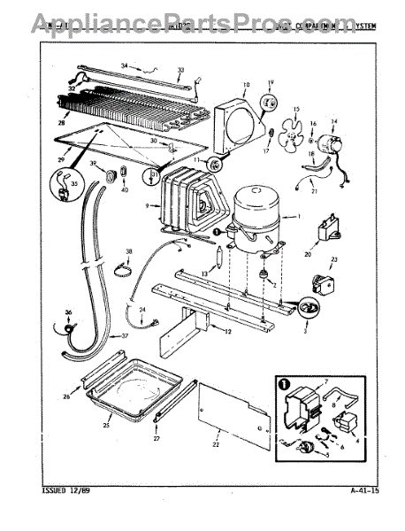 Plastic defrost pan. Evaporator pan hangs from side rails and rests on compressor.