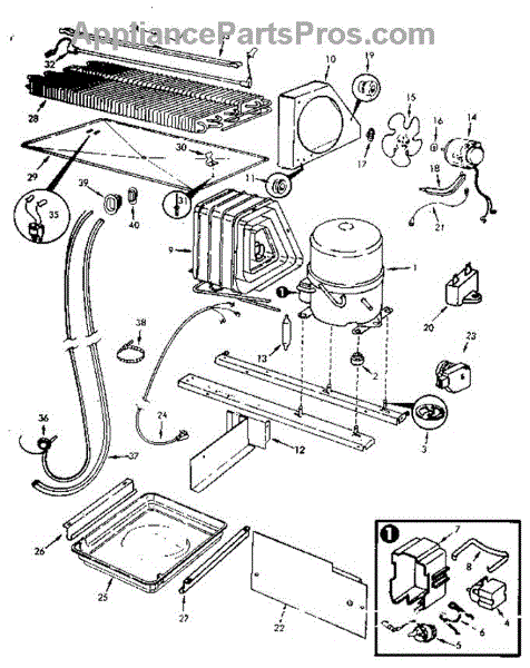 Plastic defrost pan. Evaporator pan hangs from side rails and rests on compressor.