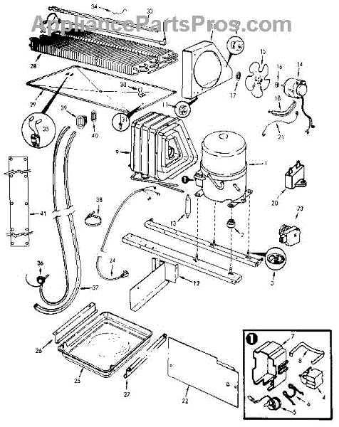 Plastic defrost pan. Evaporator pan hangs from side rails and rests on compressor.