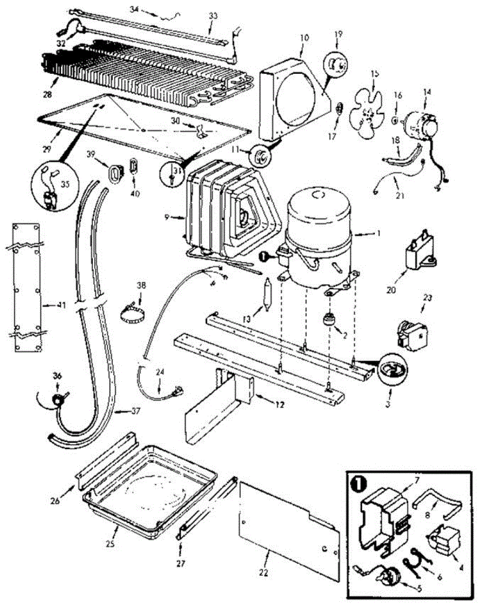Plastic defrost pan. Evaporator pan hangs from side rails and rests on compressor.