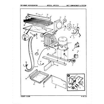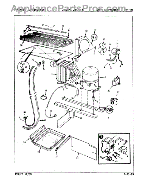 Plastic defrost pan. Evaporator pan hangs from side rails and rests on compressor.